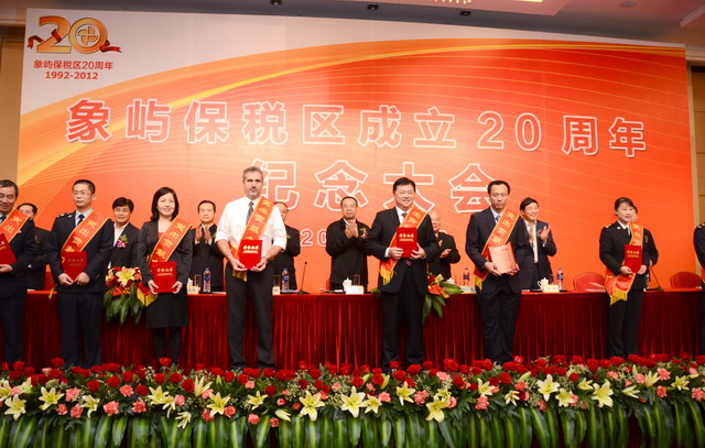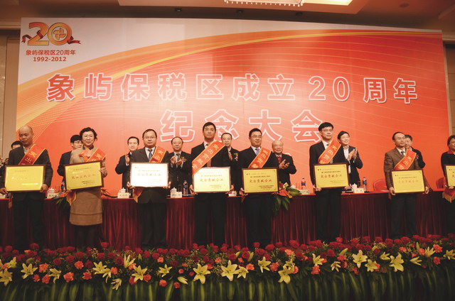 11月28日上午,在慶祝廈門象嶼保稅區(qū)成立20周年的喜慶日子里,廈門市委、市政府隆重舉行慶祝大會,回顧保稅區(qū)20年的奮斗歷程,總結(jié)保稅區(qū)20年的發(fā)展經(jīng)驗,展望保稅區(qū)更加美好的發(fā)展未來。為保稅區(qū)建設立下汗馬功勞的10家突出貢獻企業(yè)和10位突出貢獻個人受到了隆重表彰。其中,廈門象嶼集團有限公司、廈門象嶼股份有限公司榮獲突出貢獻企業(yè),象嶼集團黨委書記、董事長王龍雛,象嶼建設集團常務副總經(jīng)理王澍陶榮獲突出貢獻個人。