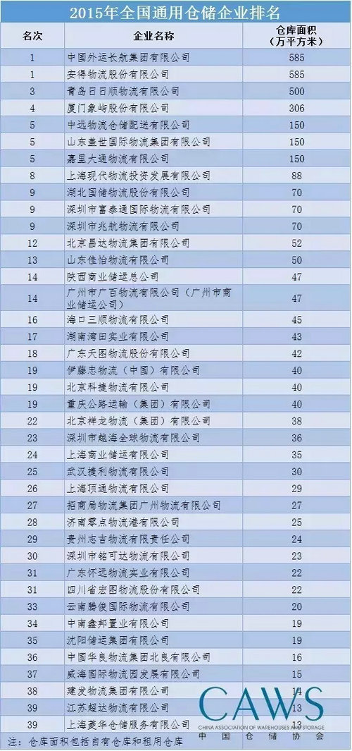 該榜單由中國倉儲(chǔ)協(xié)會(huì)根據(jù)企業(yè)自愿申報(bào)和調(diào)查掌握的行業(yè)數(shù)據(jù),以2015年底企業(yè)自有和租用倉庫設(shè)施的總規(guī)模為依據(jù),共排出全國倉儲(chǔ)企業(yè)100強(qiáng),其中包括“通用倉儲(chǔ)企業(yè)40強(qiáng)”、“倉儲(chǔ)地產(chǎn)企業(yè)10強(qiáng)”、“冷藏倉儲(chǔ)企業(yè)30強(qiáng)”、“?;穫}儲(chǔ)企業(yè)10強(qiáng)”和“危化品儲(chǔ)罐企業(yè)10強(qiáng)”。