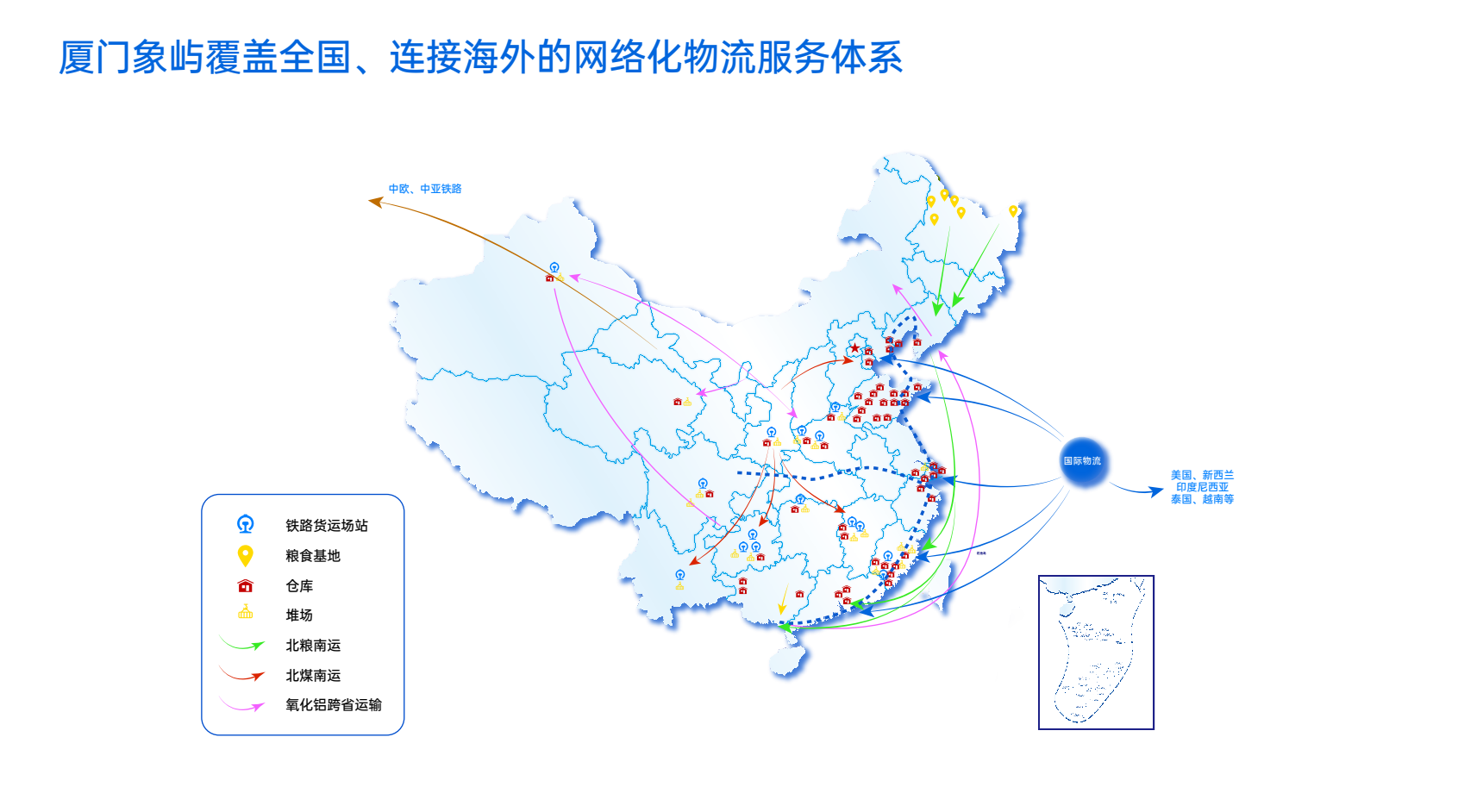 截至2021年底,象嶼股份在中西部及東部沿海布局自營倉儲節(jié)點(diǎn)40余個,倉容能力約300萬噸,合作倉庫超2500家,服務(wù)產(chǎn)品涵蓋化工、橡塑、農(nóng)產(chǎn)品、鋼鐵、木材、漿紙等。在東北及中西部地區(qū)大宗商品集散區(qū)域承接散糧、煤炭、氧化鋁等大宗商品運(yùn)輸任務(wù),已形成貫通中西、串聯(lián)南北的國內(nèi)鐵路運(yùn)輸通道及網(wǎng)絡(luò)。配套自有及租賃鐵路貨運(yùn)場站20個、擁有集裝箱堆場和倉庫逾250萬平方米,自備集裝箱2.6萬個,年均鐵路運(yùn)輸網(wǎng)絡(luò)發(fā)運(yùn)能力超1600萬噸,居行業(yè)前列,形成“山東、河南—新疆”“陜西—云貴川”等優(yōu)質(zhì)煤炭、鋁產(chǎn)品運(yùn)輸線路。