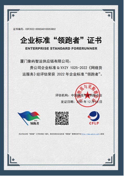 近日,“企業(yè)標(biāo)準(zhǔn)領(lǐng)跑者管理信息平臺”正式發(fā)布“物流服務(wù)”領(lǐng)域首批企業(yè)標(biāo)準(zhǔn)“領(lǐng)跑者”企業(yè)名單。象嶼股份旗下廈門象嶼智運供應(yīng)鏈有限公司憑借高水平的網(wǎng)絡(luò)貨運服務(wù)質(zhì)量,良好的服務(wù)信譽以及扎實的企業(yè)管理體系,榮膺首批網(wǎng)絡(luò)貨運服務(wù)“領(lǐng)跑者”。